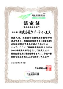 このたび、経済産業省および日本健康会議が推進する「健康経営優良法人認定制度」において、「健康経営優良法人2026(中小規模法人部門)」に認定されました。